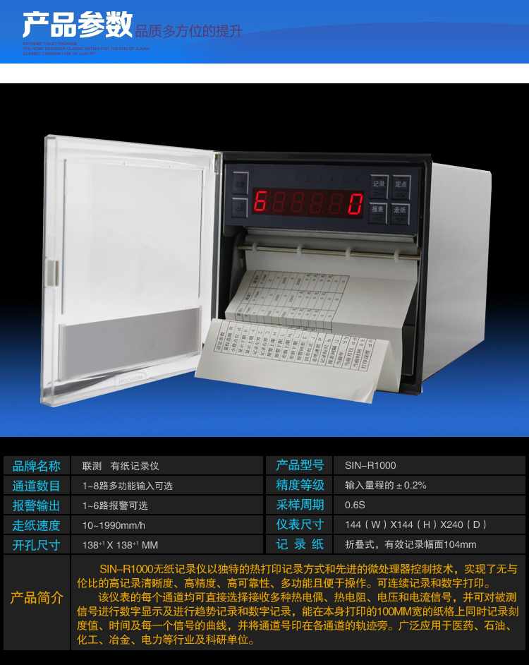 SIN-R1000有紙溫度記錄儀最多具有8路輸入通道,2路模擬量輸出,通道之間采用點點隔離;均可直接選擇接收多種熱電偶、熱電阻、壓力變送器、電壓、電流信號,并可對被測信號進行數字顯示及進行趨勢記錄和數字記錄,能在本身打印的120mm寬的紙格上同時記錄刻度值、時間及每一個信號的曲線,并將通道號印在各通道的軌跡旁。打印記錄功能采用進口固定式熱敏頭,無筆墨消耗,無筆位誤差,抗震動。